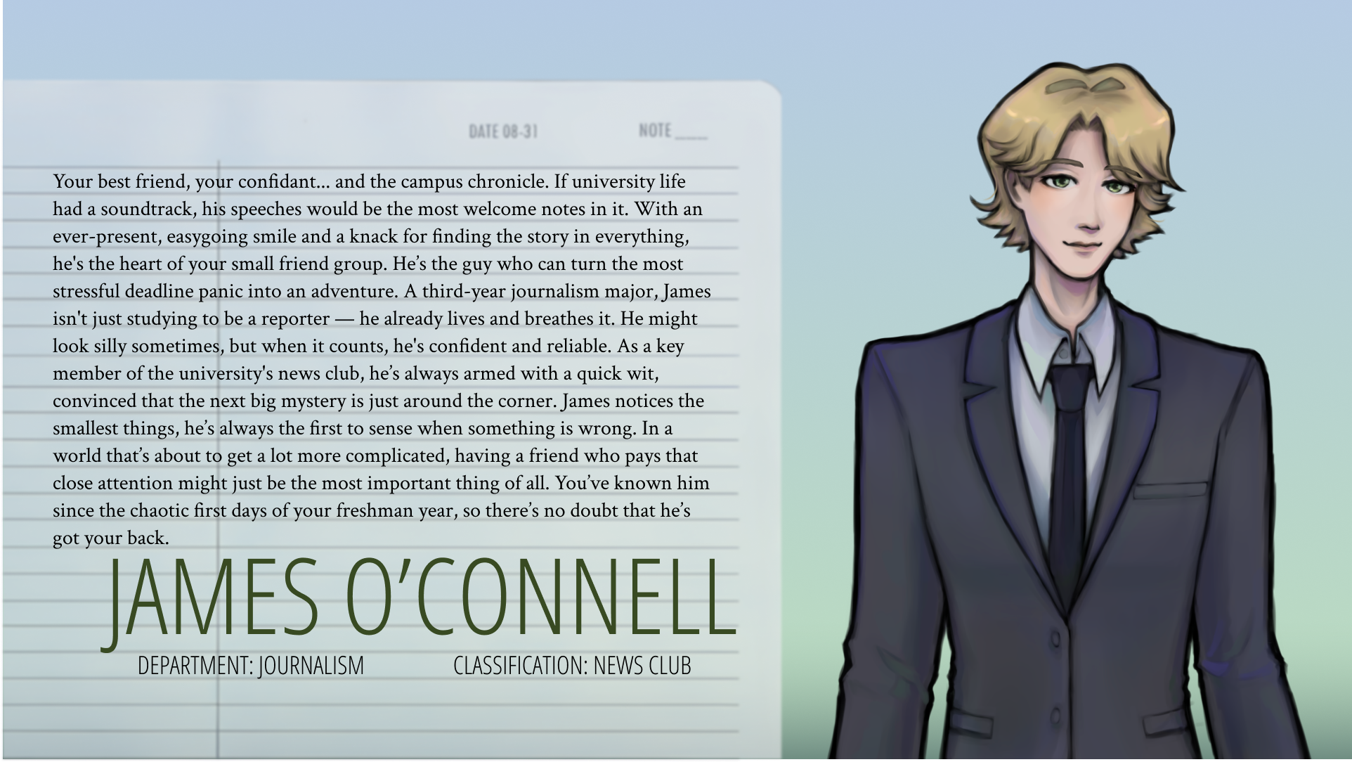 You always had a feeling you were meant for something more. When you earned a spot at the prestigious Dallen University, it felt like the first step on that path, even if it happened by sheer luck. This is your opportunity to build a better future, not just for yourself, but to find a way to make your own small corner of the world a little brighter. Now, you’re starting your second year, and this time, it’s going to be different. There’s Chris, your fiercely loyal best friend from the history department, always ready with a witty remark and an unwavering support. There’s also James, the charming and endlessly energetic journalist from the news club, who somehow always knows how to lighten the mood. Together, you’re navigating the challenges of university life, and for the first time, it truly feels like you belong.