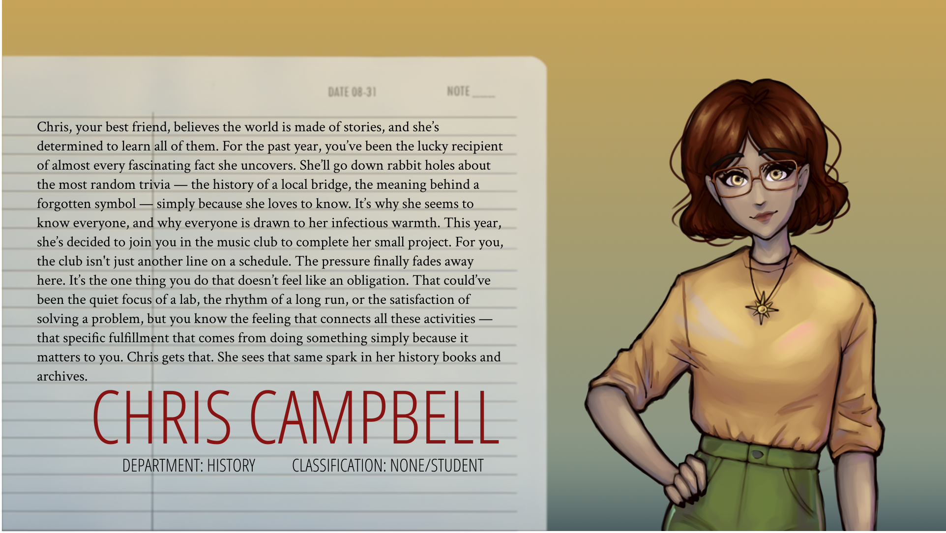 You’ve joined the music club, finding a quiet passion that always made you want to do your best. It’s your escape, something that always makes sense when other things don’t. As the new semester unfolds, you’ll find that the most important lessons aren't taught in a lecture hall. The choices you face and the moments you share will begin to change your life in ways you never could have imagined.